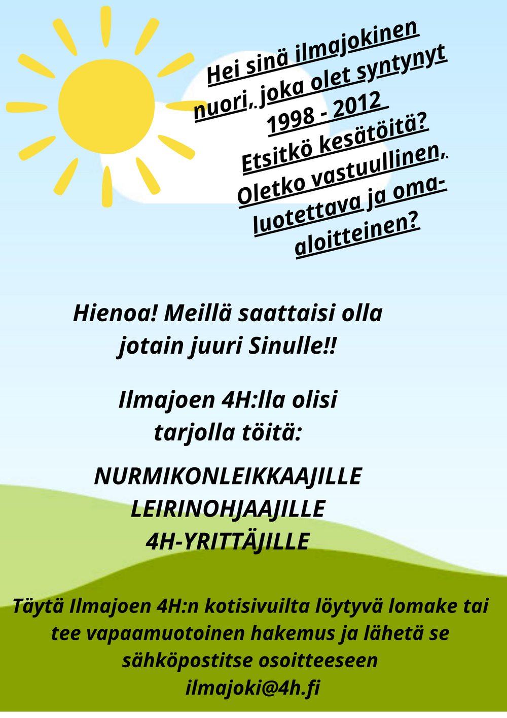 Yksi 4H-järjestön päätarkoituksista on työllistää nuoria. Tiesitkö, että 4H-yhdistykset ympäri Suomea työllistävät vuosittain yli 7 000 nuorta? Haluaisitko sinäkin olla yksi heistä?